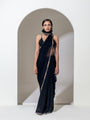 Black organza saree with sequin and bead embroidered border. Comes with a one metre unstitched blouse piece.